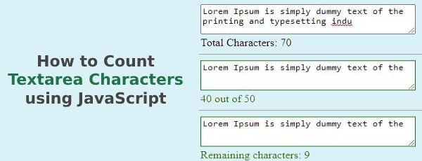 You will see the live notification Whenever the user begins to enter text into the Textarea field. It is very simple to implement & understand. So, you can easily create live characters counter Using javascript.